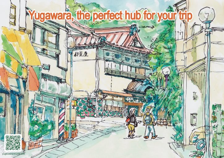 表面は、湯河原温泉の街並みをスケッチしている 広瀬正一朗さんの味わいあるイラストです。